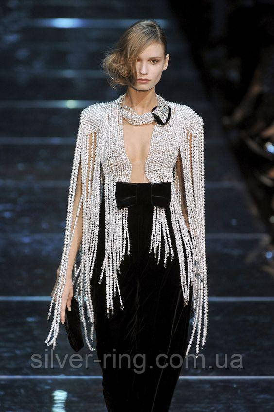 Перлове намисто Chanel може похвалитися відкликанням про історію моди з цим виробом. І в той час як інші грають з перлами новими і незвичними способами, Карл Лагерфельд байдуже дотримується оригінального дизайну Коко, зшиваючи м'які білі блискучі перлини на пов'язки і коміри. Єдина новинка в тому, що перлина Шанель стала трохи більше.
